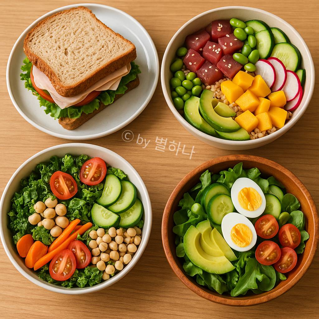 - 샐러드 또는 샌드위치: 많은 카페에서 신선한 샐러드나 통곡물 빵으로 만든 샌드위치를 판매해요. 드레싱은 따로 달라고 요청하거나, 올리브 오일과 발사믹 식초 베이스의 가벼운 드레싱을 선택하여 칼로리를 조절해 보세요. 닭가슴살, 연어, 아보카도, 삶은 달걀 등 단백질과 건강한 지방이 풍부한 재료가 들어간 샌드위치를 고르는 것이 좋습니다.